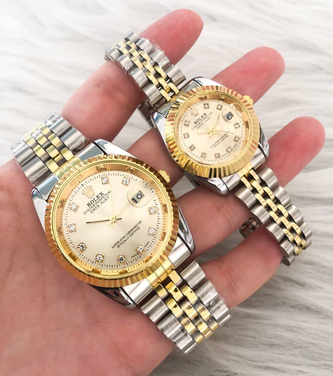 ست ساعت مردانه و زنانه لاکچری و خاص رولکس بند استیل صفحه طلایی باشیشه ذره بینی