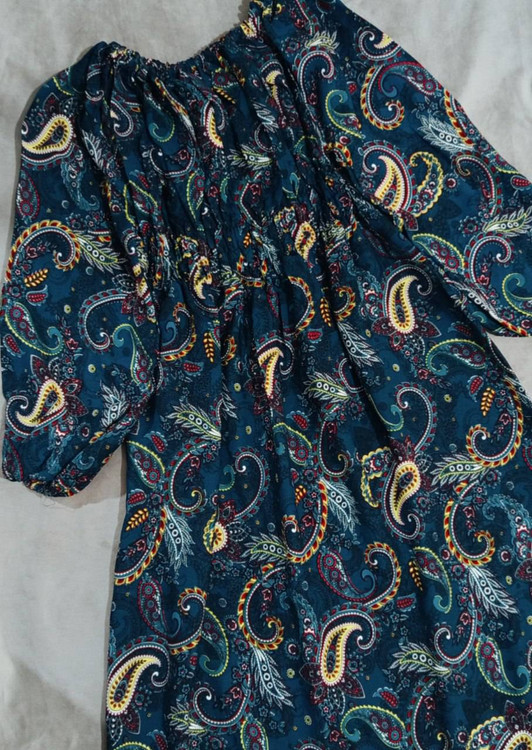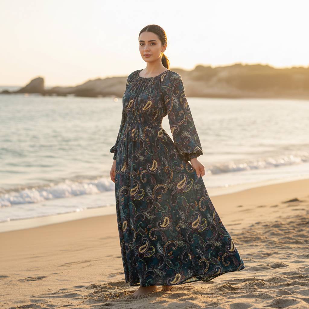 پیراهن بلند ماکسی ساحلی نخی یقه دوحالته طرح جذاب بته جقه