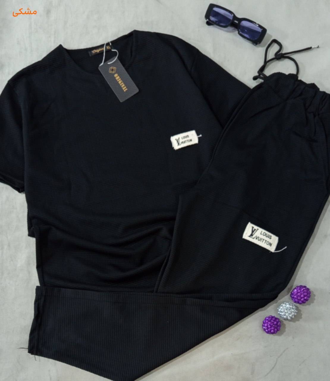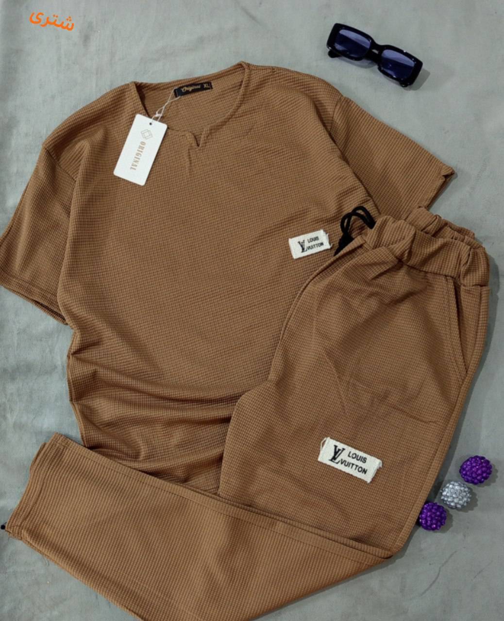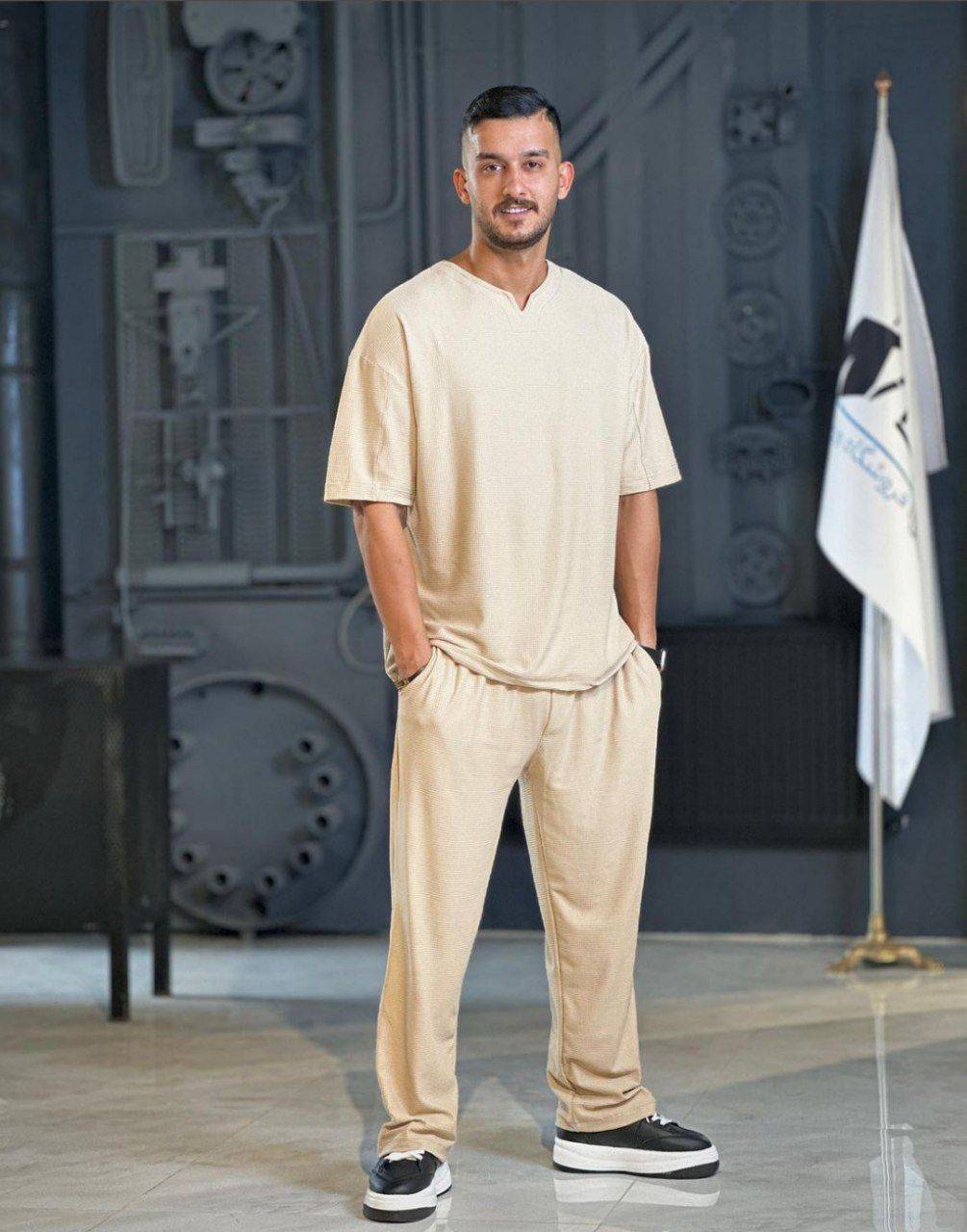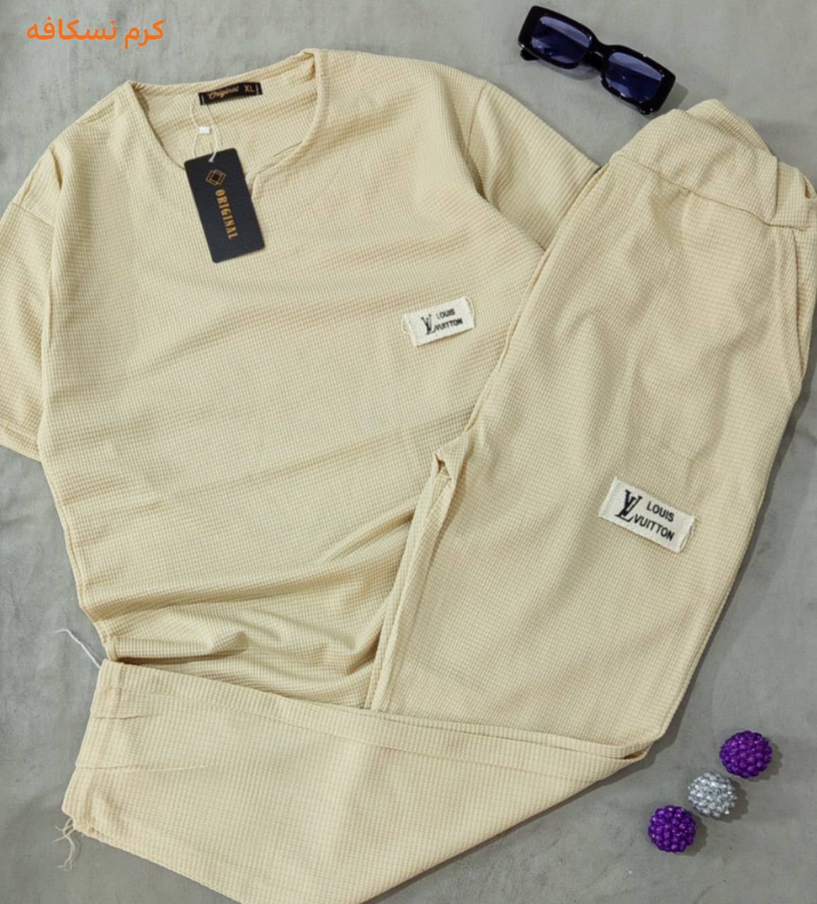 ست مردانه تیشرت شلوار یقه کوبایی کنف دوزی بیسکویتی نرم ولطیف