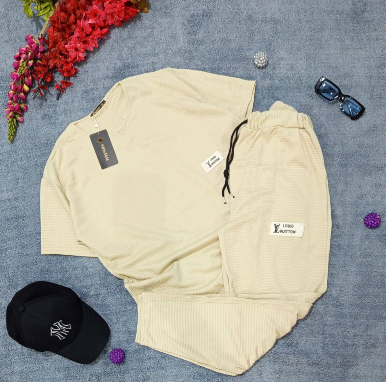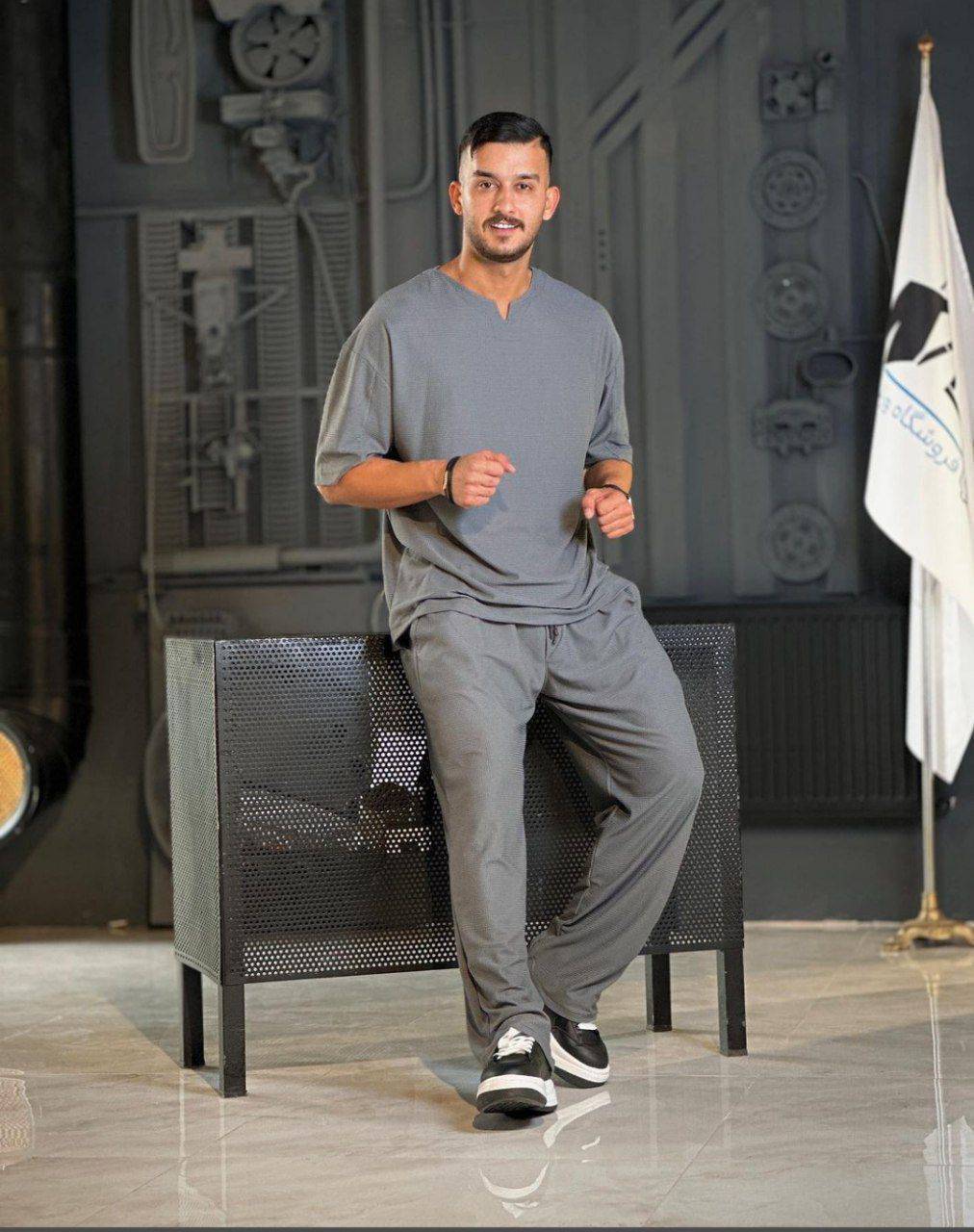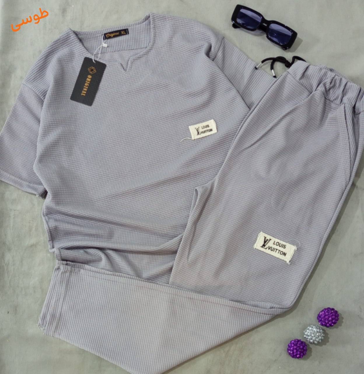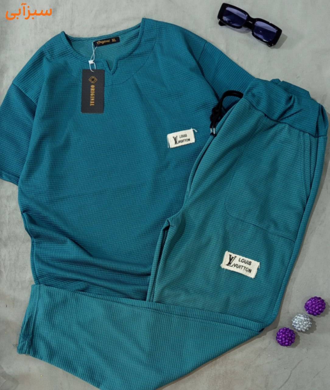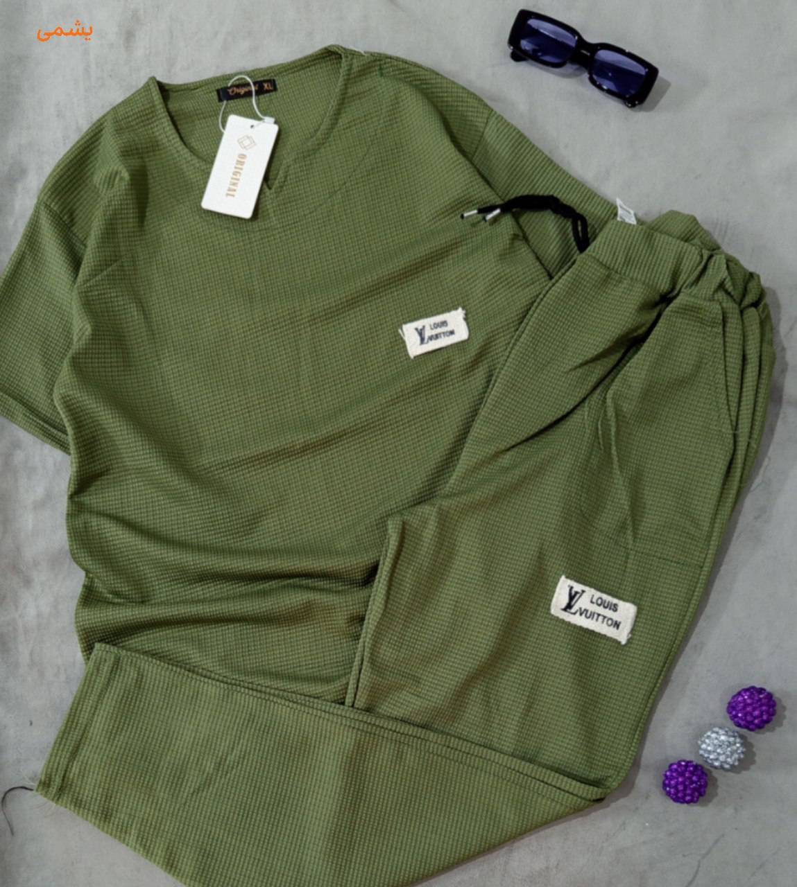 ست مردانه تیشرت شلوار یقه کوبایی کنف دوزی بیسکویتی نرم ولطیف