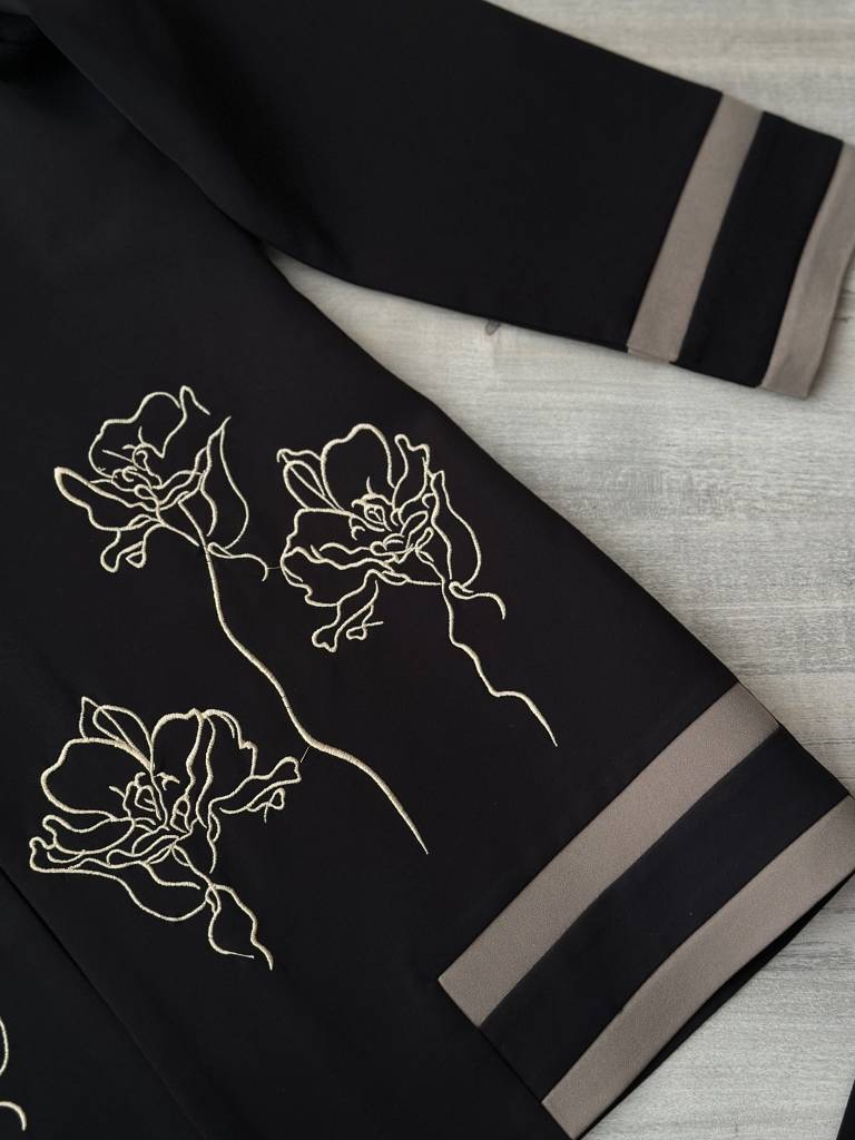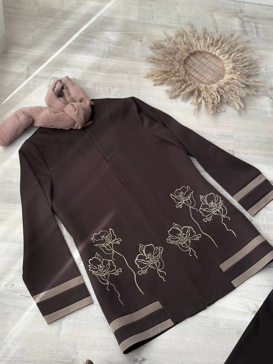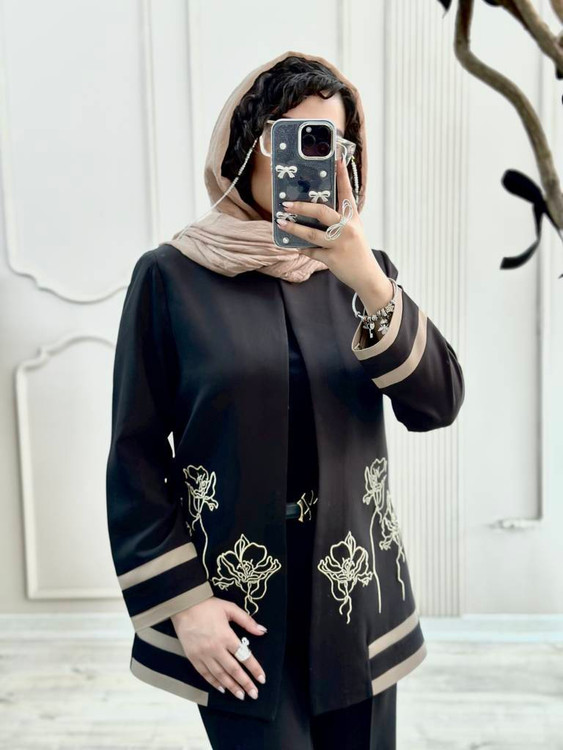 تیکه دوزی زیبا در قسمت پایین مانتو و لبه های آستین